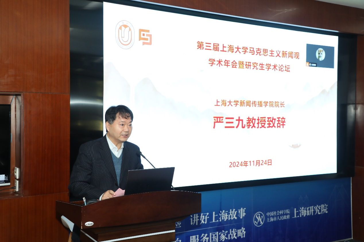 AC米兰官方网站新闻传播学院院长严三九教授热烈欢迎各位与会专家学者深入探讨马新观与新闻传播实践相结合,并感谢大家为中国特色新闻传播学发展贡献智慧。