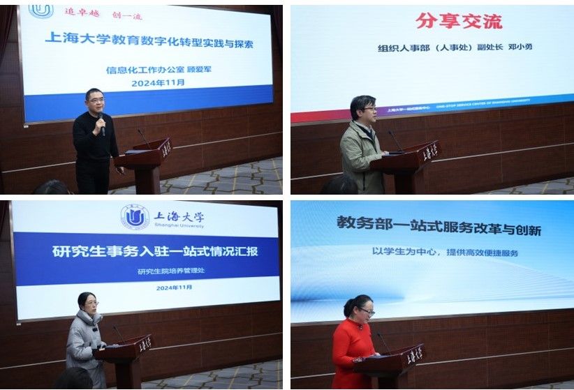 分享交流环节,顾爱军介绍了信息办在人工智能基础建设、AI+教学、AI+科研、AI智慧校园等维度进行的实践探索,指出学校正努力构建AI+教育的新生态,全力推进教育数字化转型。邓小勇分享了人事处紧密配合一站式服务建设,围绕人事报到、人事证明、人事政策咨询贴心服务教职工,未来将拓宽服务范围,不断提升服务能级。黄睿介绍了研究生院业务流程的优化情况,线上今年共计优化新增9项自助证明,线下借助一站式服务平台全年为学生提供火车票优惠卡充值服务,使学生办事更加便捷。姚小洁分享了教务部以学生为中心改变传统服务模式,采取首办负责制、线上线下相结合、前后台相互支撑等新模式开展服务的成效。