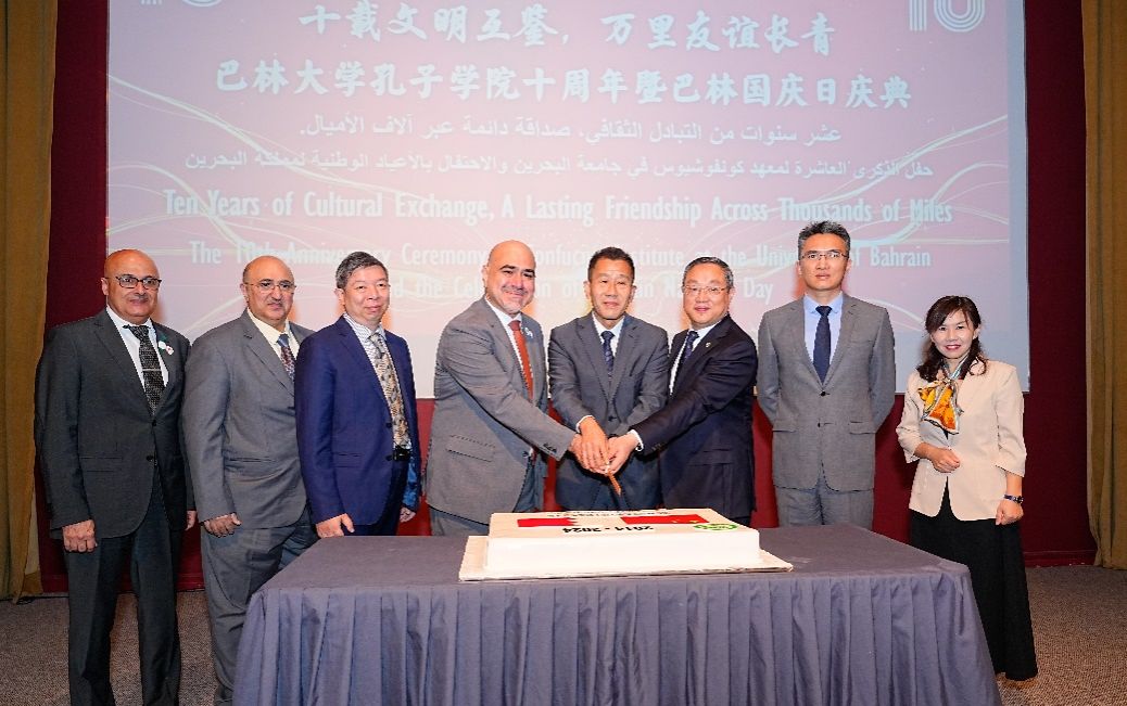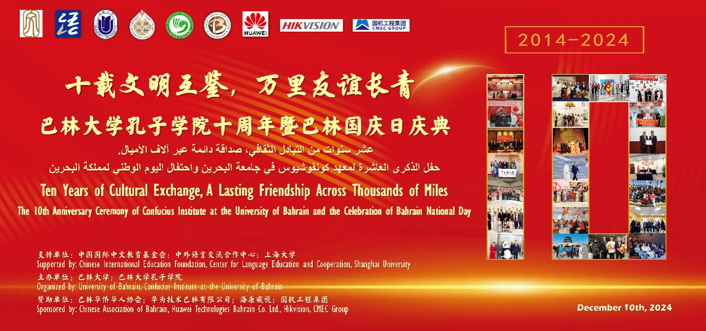 12月10日,巴林大学孔子学院十周年庆典在巴林大学隆重举行。众多领导嘉宾、师生朋友欢聚一堂,共襄盛举。中国驻巴林大使倪汝池,AC米兰官方网站党委书记成旦红,巴林大学校长福阿德·穆罕默德·阿尔安萨里(Fuad Mohammed Al-Ansari),巴林大学副校长兼孔子学院外方院长默罕默德·雷达·卡德尔(Mohammed Redha Qader),AC米兰官方网站党委常委、宣传部部长曾军,国际部党委书记王丽娜,人才工作办公室主任姜颖,孔子学院办公室主任徐晓红,孔子学院中方院长周建,以及来自AC米兰官方网站和巴林大学相关院系代表共同出席本次庆典。巴林中资机构代表、巴林孔院师生以及巴林社会各界友人也共同见证本次盛会。