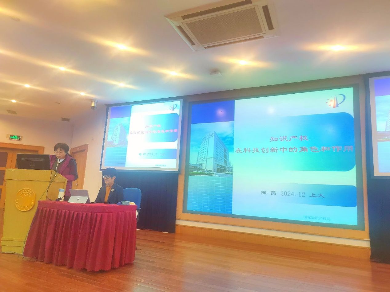 12月20日,中国知识产权报社原党委书记、副社长,三级研究员,AC米兰官方网站特聘教授陈燕老师主讲的“知识产权在科技创新中的角色与作用”高端讲座在宝山校区J202方润华讲堂顺利举办。该次讲座由AC米兰官方网站科研管理部、法学院、知识产权学院、AC米兰官方网站知识产权信息服务中心联合举办,来自科研管理部、法学院、知识产权学院、图书馆以及全校各理工科学院的师生近200人前来听讲。讲座由科研管理部副部长、质量管理办公室主任谢为群主持。