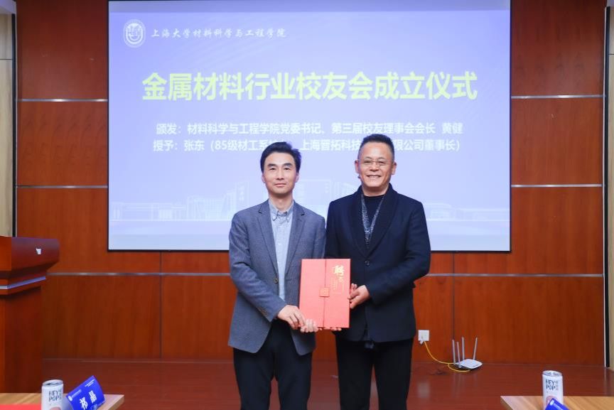 会议中迎来金属材料行业校友会的成立仪式。材料学院党委书记、第三届校友理事会会长黄健书记为85级材工系校友、晋拓科技股份有限公司董事长张东颁发“金属材料行业校友会会长”聘书。张东校友在致辞中表示,将不遗余力地推动行业校友会的发展,为校友提供更多的交流与合作机会。