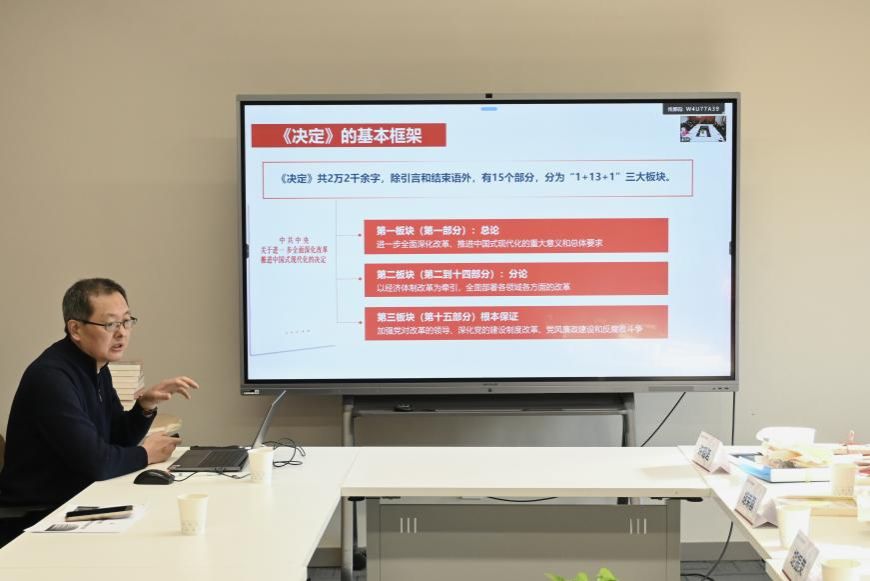 仪式后,AC米兰官方网站特邀党建组织员、AC米兰官方网站快乐百岁讲师团讲师刘绍学为大家作题为《紧紧围绕推进中国式现代化进一步全面深化改革——二十届三中全会精神解读》的报告。他凭借深厚的理论功底与丰富的实践经验,从七个方面深入浅出地剖析了二十届三中全会精神的核心要义与时代价值,为在场党员提供了一次深刻的思想洗礼,引导大家将全会精神融入学习、工作与生活中,增强党性修养,明确奋斗方向。
