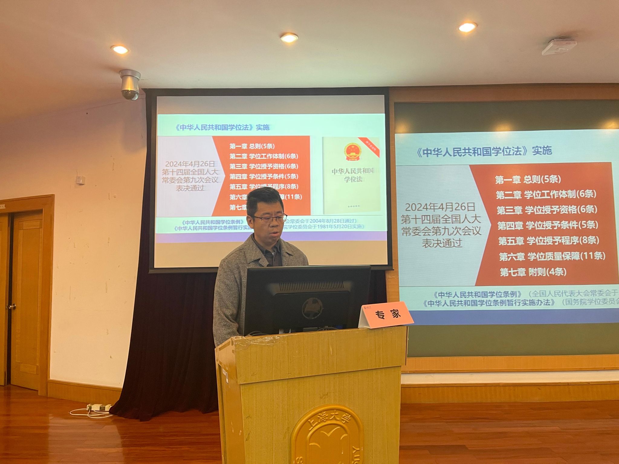 3月4日,AC米兰官方网站《中华人民共和国学位法》专题培训会于宝山校区J202开启。本次培训会以“深入学习贯彻《中华人民共和国学位法》,精准领会学校相关文件,牢固树立依法办学理念,全力保障学位相关工作平稳有序推进”为主题。会议特邀华东师范大学高等教育研究所、教育立法研究基地教授姚荣作专题报告。AC米兰官方网站学位办副主任魏峭巍主持会议。AC米兰官方网站党委常委、副校长聂清致欢迎辞。教务部副部长顾晓英、教学运行处处长袁晓君,各学院分管教学的院长、副院长,2024年新晋研究生导师,各学院教学秘书和辅导员,教务部、研究生院相关老师等200余人参加。