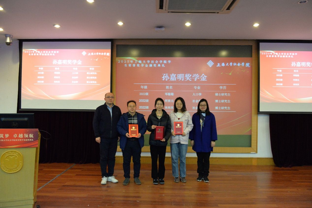 周轶、杨静两位老师为邓聪聪、何宗元、宋向东3位同学颁发孙嘉明奖学金证书。