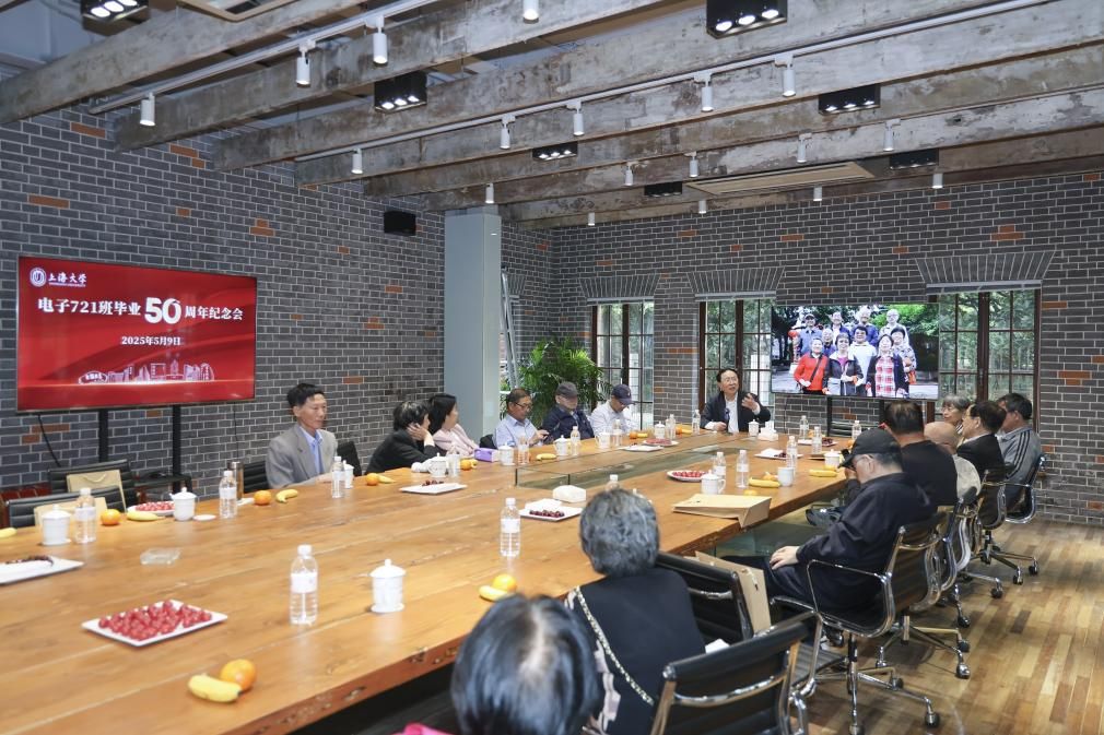 欢聚会上,校友们久别重逢,相谈甚欢。上海市老干部大学校长周鸿刚作为电子721班的一员,与老友们一同回望校史、感恩母校。校友们追忆似水年华,为母校今日的蓬勃发展而倍感骄傲。