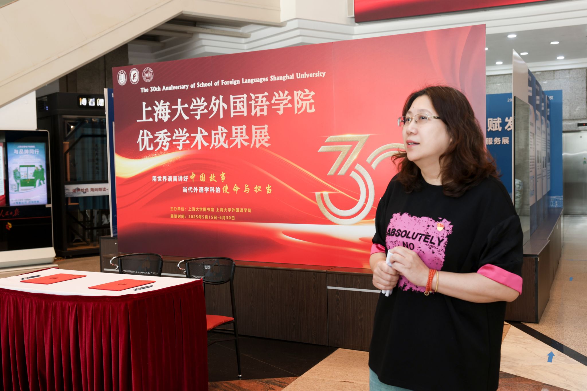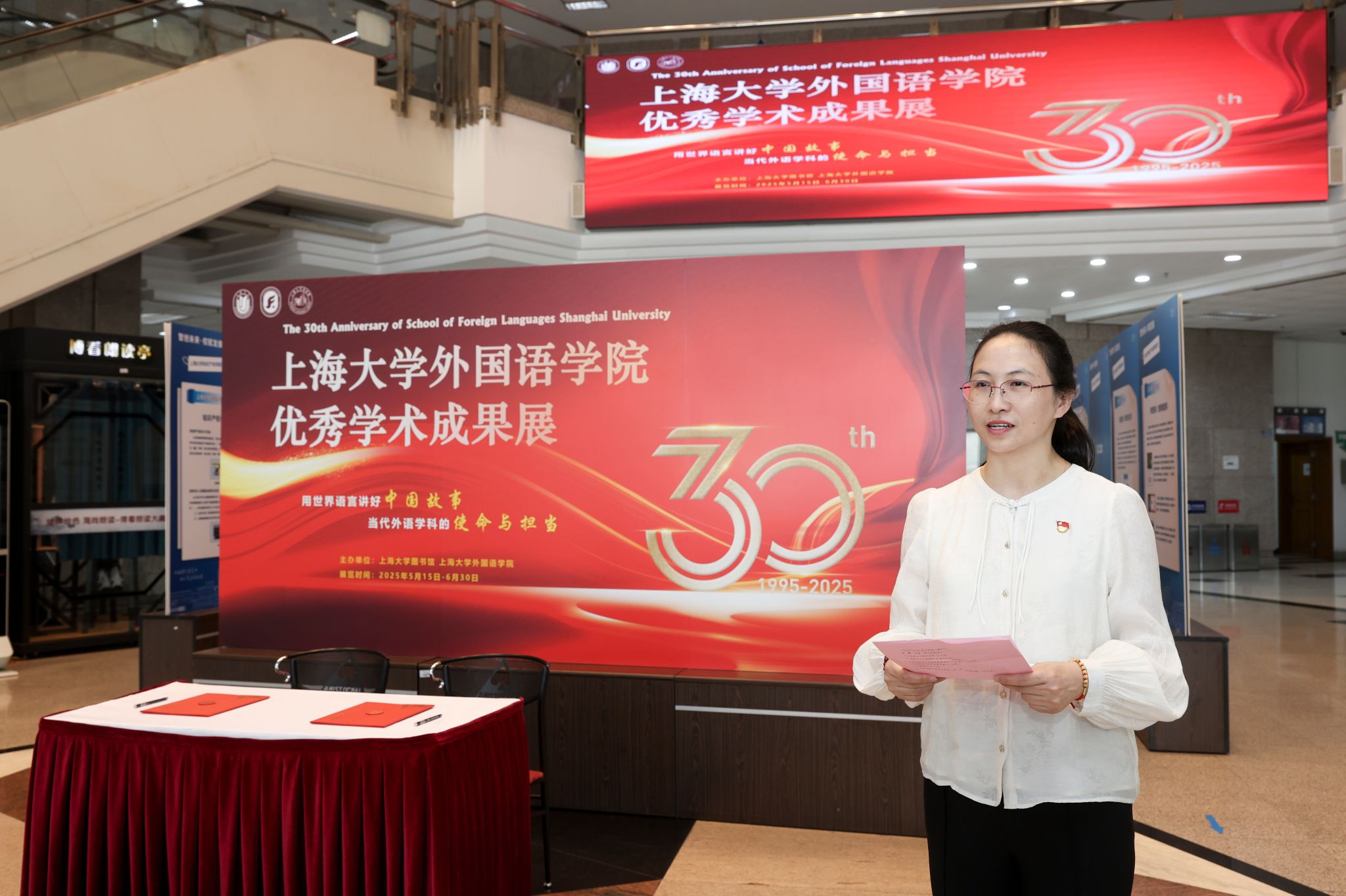 外国语学院党委书记吴蔚详细介绍了庆祝建院30周年系列活动的筹备情况,回顾了学院自成立以来的发展历程与取得的重要成就,并指出,在“十四五”规划的收官之年举办此次学术成果展,意义重大。展览不仅是对外国语学院建院30周年学术成果与育人成果的一次系统性梳理与总结,更为外国语学院在数智时代学科转型发展、育人模式创新以及科学谋划“十五五”规划提供了重要的参考依据。最后,吴蔚书记代表学院由衷地感谢图书馆对外国语学院庆祝建院30周年活动的大力支持和热情帮助。