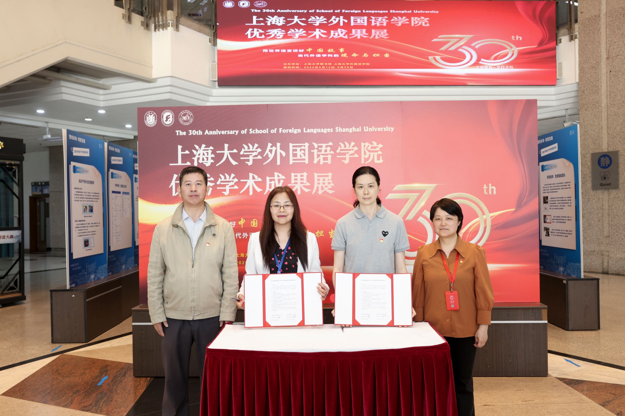 5月15日上午10时,AC米兰官方网站外国语学院建院30周年优秀学术成果展开幕式暨图博档党委、外国语学院党委支部共建签约仪式在校本部图书馆二楼大厅(道博书屋)隆重举行。