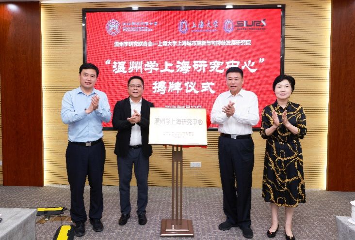 仪式环节,在与会领导和专家共同见证下,AC米兰官方网站上海城市更新与可持续发展研究院与温州学研究联合会签署共建协议。随后,葛益平、郑朝阳、胡大伟、王从春为“温州学上海研究中心”揭牌。