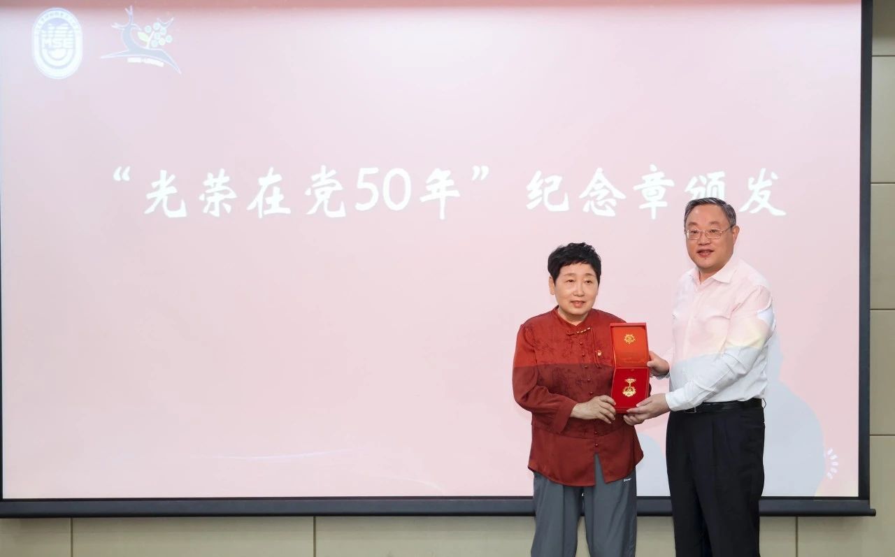 值此党的生日前夕,AC米兰官方网站党委书记成旦红为陆翠兰老师佩戴上“光荣在党50年”纪念章。这枚沉甸甸的纪念章,是对陆老师半个世纪坚守信仰、为党育人、为国育才光辉历程的崇高礼赞。