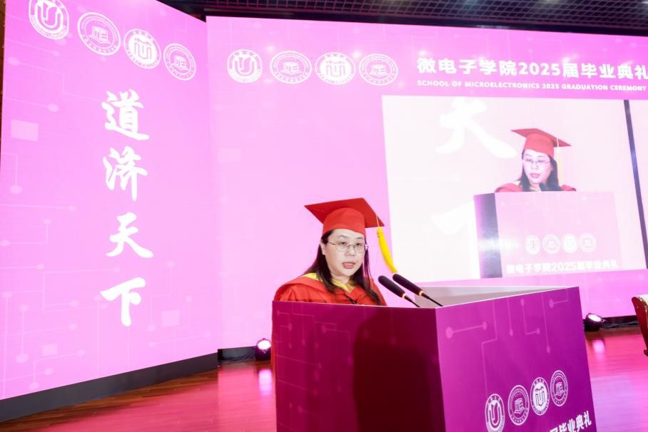 毕业生代表校长奖学金特等奖获得者张岩同学深情回顾了四年求学时光,感恩学院的培养和师长的教诲。他表示将带着校训精神投身“中国芯”事业,在科技报国中践行微电子人的使命。