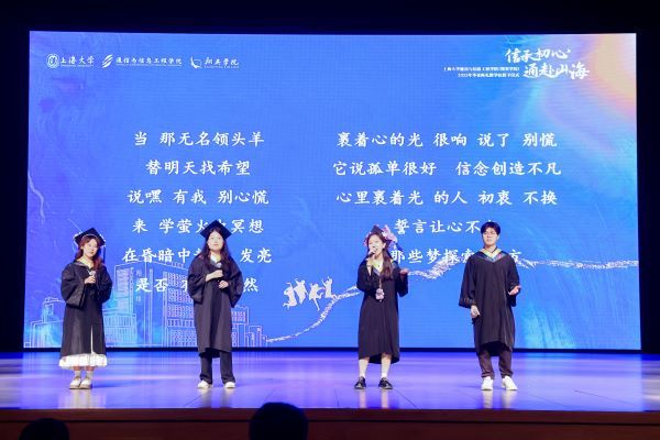 毕业生节目环节,刘鹏宇、吴心怡等10位同学带来幕布剧《韶光剪影》,运用光与影的艺术展现了大学生活中的点点滴滴,每个片段都将沉淀为未来的美好回忆;张煜东、赵依卓等4位同学献上歌曲联唱——《裹着心的光》和《凤凰花开的路口》,用歌声唱出了对过去的不舍和对未来的憧憬。