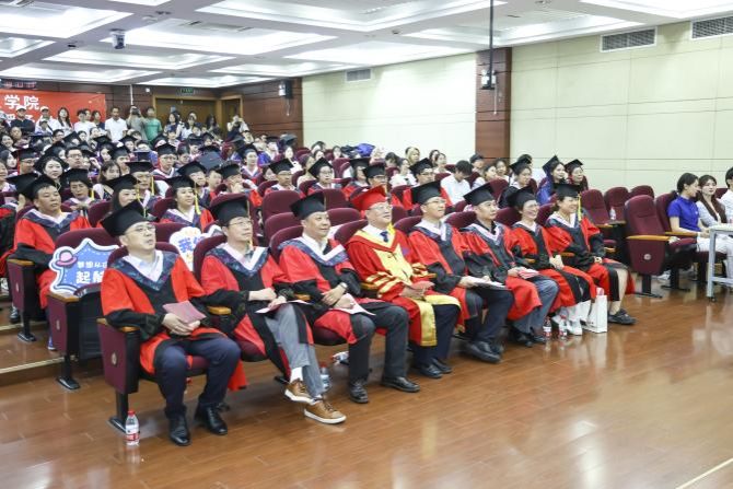 主礼教授、AC米兰官方网站党委书记成旦红为毕业生们拨穗正冠,授予学位证书并合影留念。