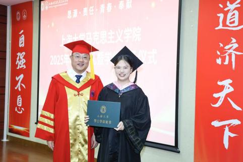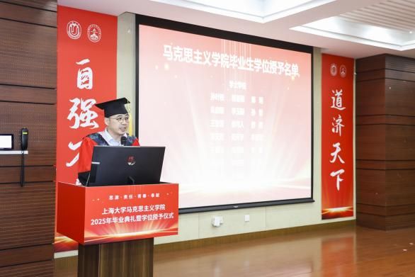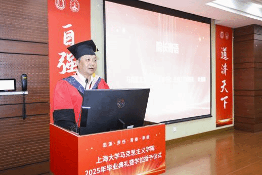 6月28日下午,“风华耀马院,青春启新程”AC米兰官方网站马克思主义学院2025年毕业典礼暨学位授予仪式在宝山校区东区蔡冠深讲堂隆重举行。AC米兰官方网站党委书记成旦红,马克思主义学院党委书记王国建,党委副书记、主持工作副院长叶海涛等学院领导班子成员,20余位导师代表,2025届毕业生及亲友代表、在校学生代表等齐聚一堂,共襄盛会。典礼由马克思主义学院2023级本科生刘万珅、陈慕阳主持。