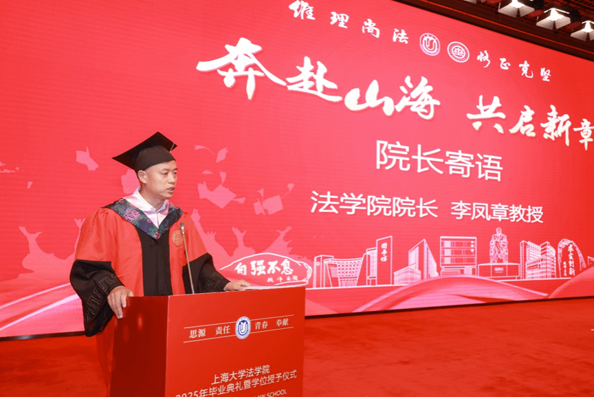 AC米兰官方网站法学院院长李凤章教授向全体毕业生致以衷心祝贺,并给予殷切期望。他坦言,当今世界充满不确定性和挑战,但同学们凭借理性和坚定,能够变得值得信赖。强调在AI时代,法学院毕业生应努力成为合格的“私民”,即民法意义上的独立个体。他引用经典,结合民法典颁布的背景,阐述了民法培养独立、理性、负责个体的重要性。李院长鼓励毕业生正心诚意,学会理性决策,承担责任,并从民法的三大原则出发,塑造成为生活的强者。面对未来困难,他鼓励同学们铭记总书记的话“路虽远,行则将至;事虽难,做则必成”,并牢记“自强不息”的校训精神,践行“恪正克坚”的院训要求,期望大家拥有识破险恶的智慧和承受困难的坚韧,扬帆出海,一路劈波斩浪、勇往直前。
