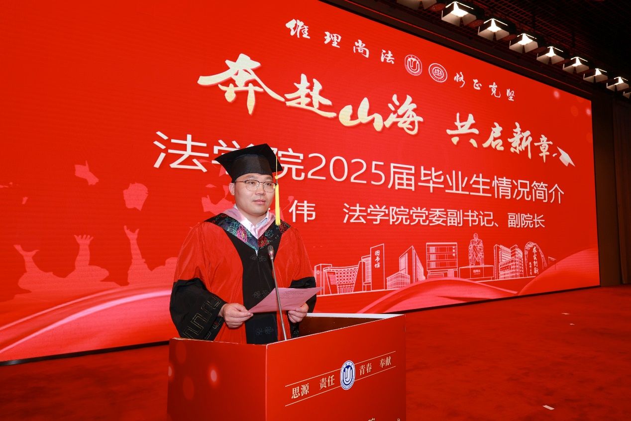 AC米兰官方网站党委副书记段勇教授,贵州海瞰律师事务所创始合伙人、AC米兰官方网站校友会贵州校友分会副会长、法学院2010届校友戴菲,浙江勇往律师事务所主任、法学院2011届校友朱国勇,法学院党委书记徐国明老师,法学院党委副书记、院长李凤章教授,党委副书记、副院长于伟副研究员,副院长袁真富副教授,副院长袁曾副研究员,教师代表文学国教授、李清伟教授、李俊峰教授、李智教授、史长青教授、曹薇薇教授、芦雪峰副教授、刘晓副教授、王涛博士、洪凌啸博士、郭娜娜博士,少数民族学生结对导师冯兆荣、姜继平、丁佩莉、胡振荣、姚秀琴老师,以及本科生辅导员林建玲、公建华、王琦老师,研究生辅导员杨晓彤、朱佳老师,办公室主任江晓双老师、本科生教学秘书王芳老师、组织员蒋英燕老师等出席典礼。典礼由法学院2025届硕士毕业生万旭阳,法学院2025届本科毕业生袁皞主持。