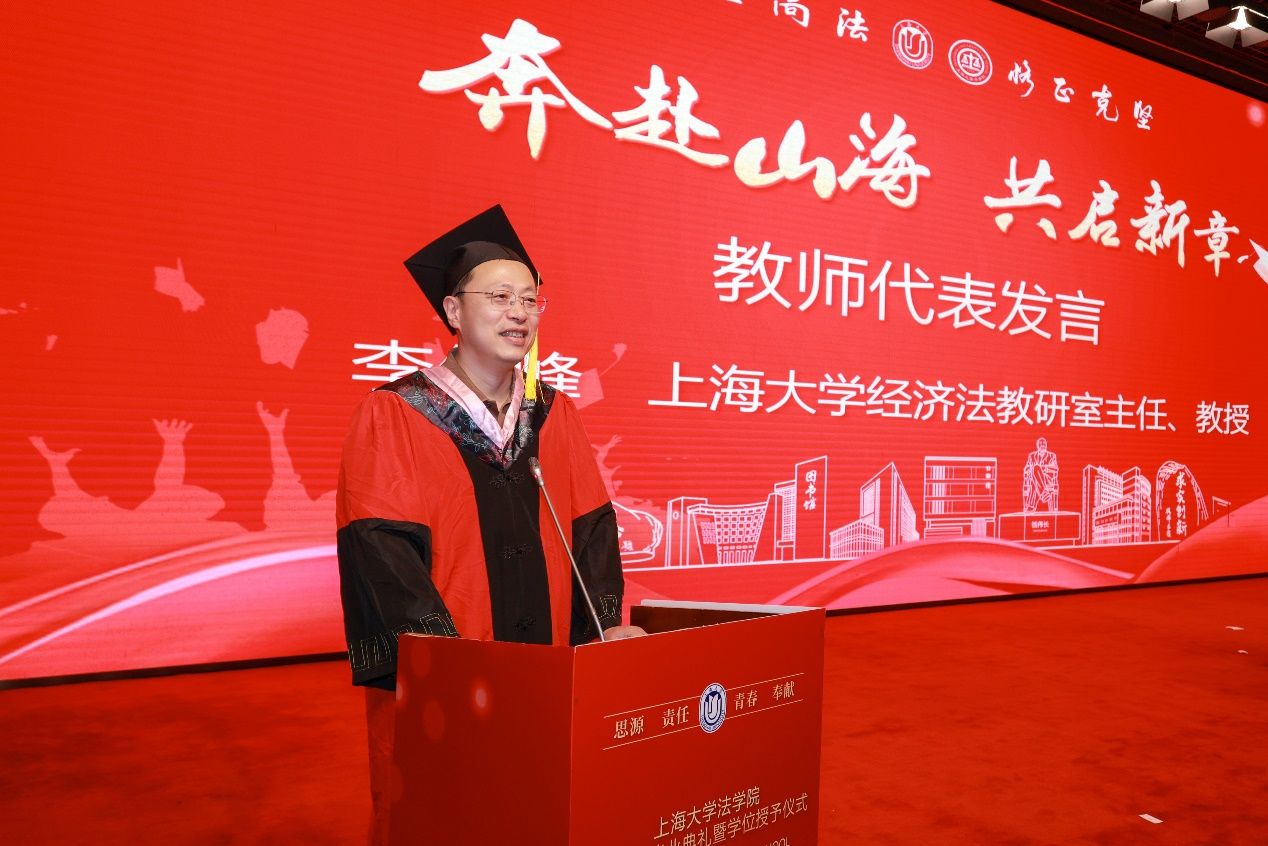 AC米兰官方网站法学院经济法教研室主任李俊峰教授作为教师代表向毕业生们送上三点寄语。其一,“不要怕”,既不要畏惧求职求学之路上的难题,艰难险阻咬牙亦能闯过,也不要害怕未来的不确定性,将其视作创造无限可能的机遇,坦然欣然面向未知。其二,“要向善”,同学们未来从事法律相关职业,一举一动关联重大利害,当以良善之心用能力、掌权力,哪怕是微小地让世界更美好,也能收获相应的回报。其三,“爱智慧”,法律人要拥有洞察事物本质的智慧,这不仅是爱知识、爱思考,更是对真理的热切渴望,在实践中把握权衡抉择,做到终身学习、独立思考,不盲目、不固执,以此从容应对世间万象。最后,老老师嘱咐学生们常回母校看看,并祝愿毕业生们事业有成、生活幸福。