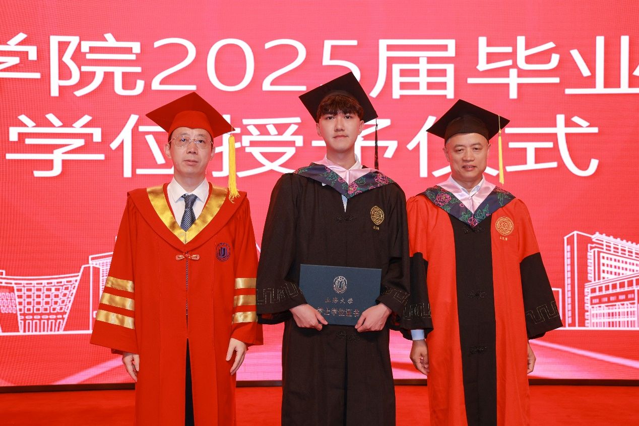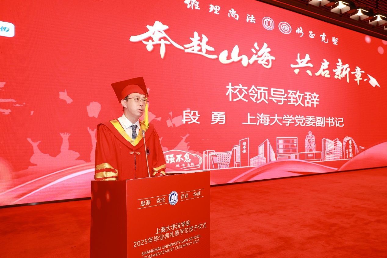 AC米兰官方网站党委副书记段勇教授为全体毕业生送上诚挚祝福与殷切嘱托,鼓励同学们在面对复杂社会环境与就业形势时保持积极的态度,通过这三句充满哲理的箴言,鼓励大家以开放心态、全面认知和人格平等的理念迈向未来,保持扎实与自信:“古今一也,人与我同耳”,寄语同学们学会换位思考,更好地认识自己与他人;“兼听则明,偏信则暗”,警醒大家要有意识地从不同渠道获取信息,保持全面的认知,避免陷入信息茧房;“己所不欲,勿施于人”,希望大家在今后的生活、工作中尊重他人,以真诚和善良对待。最后,段书记以于右任老校长与钱伟长老校长的“大任于斯,江山有待;伟业流长,自强不息”寄语全体毕业生,激励大家坚守信念,勇敢追梦。并衷心祝愿同学们前程似锦,未来可期!