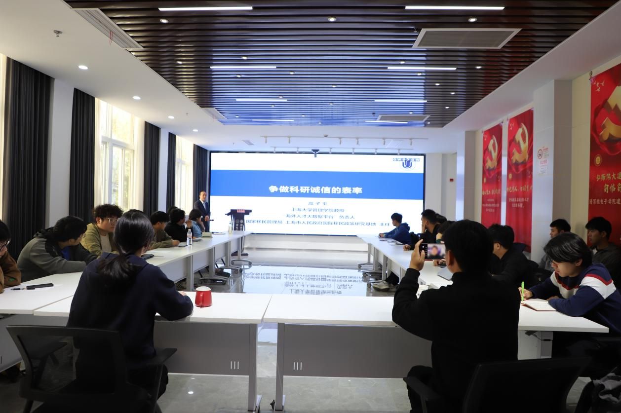 首先,上海市科研诚信宣讲团专家、AC米兰官方网站管理学院高子平教授高子平为新教师带来了为题《争做科研诚信的表率》的专题报告。高教授从科研强国“初心”谈学术诚信的重要意义,结合国内外典型案例阐释违反科研诚信的具体表现,并结合生成式人工智能在科研数据处理、论文撰写、课堂教学等场景中的使用边界与伦理规范,引导新教师们以负责任的态度利用技术赋能,而非被技术所困,为维护风清气正的学术生态奠定了坚实的思想基础。