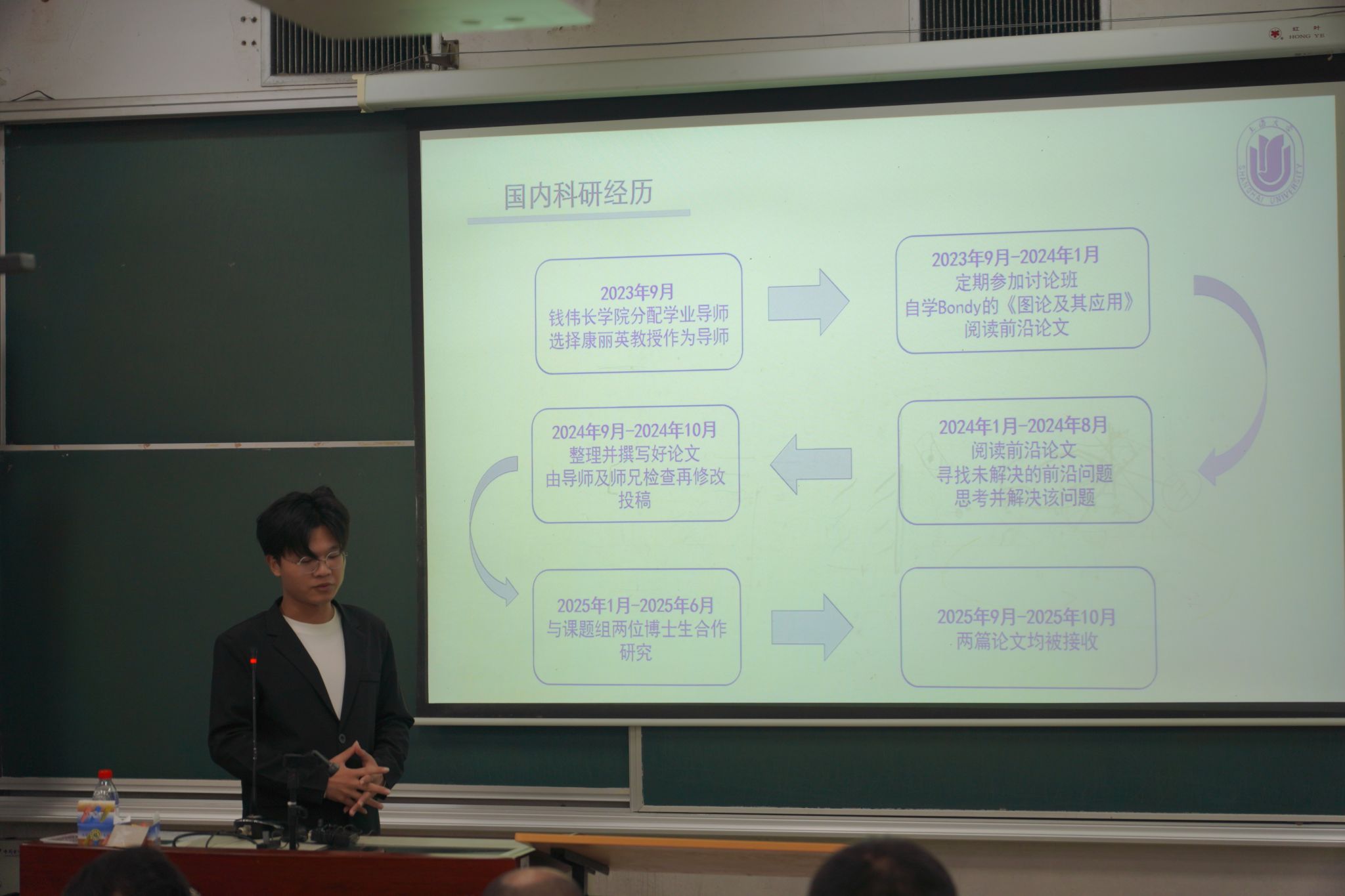 在朋辈分享环节,学院2023届数学与应用数学专业本科毕业生、理学院数学系直博生高子涵结合自身连续发表多篇SCI论文的经历,分享了“在能力范围内做到最好,比追求完美更重要”的科研理念,鼓励同学们善用学术平台、积极交流碰撞、锻炼表达能力。