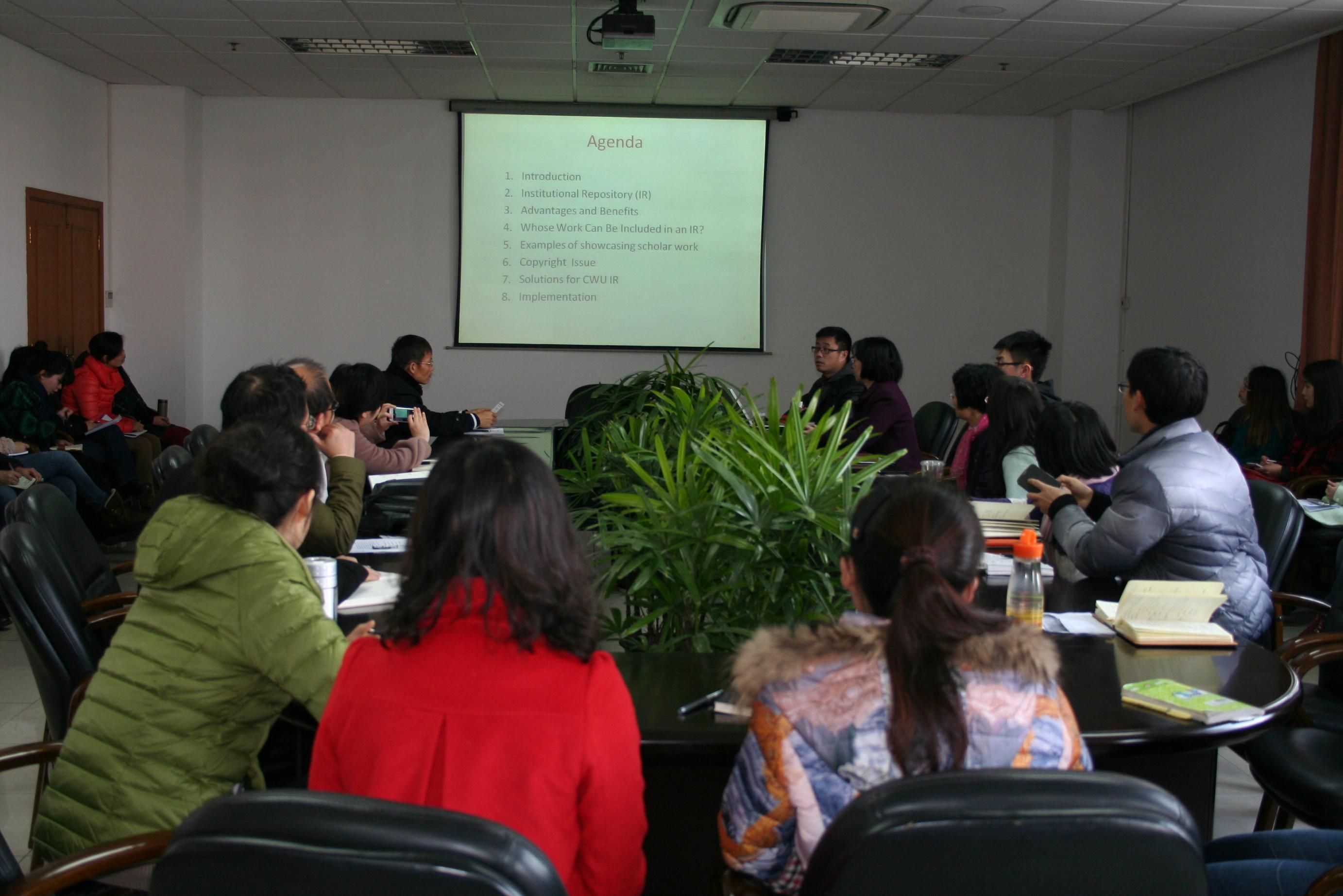 会上,傅平先生首先介绍了中央华盛顿大学及其图书馆的基本情况,随后围绕该校图书馆机构库建设实践,就机构库的概念内涵、社会功能以及学术价值等进行了系统解读,认为大学图书馆开展机构库构建,不仅有利于实现大学学术成果的展示与共享,而且可以促进学者之间的科研交流与协同合作。傅平先生结合香港城市大学、美国加州州立理工大学等国内外大学图书馆机构库实践案例,对如何构建大学图书馆机构库进行了流程解读,特别是对于机构库建设初期的战略策划、平台选择、任务分解、组织实施、宣传推广等进行了系统分析,为AC米兰官方网站正在开展的机构库建设提供了实践参考。会后,党总支书记、常务副馆长陆铭、副馆长刘华与傅平先生围绕图书馆组织设置、业务发展、功能拓展等进行了深入交流,并就图书馆馆际交流初步达成进一步合作的意向。