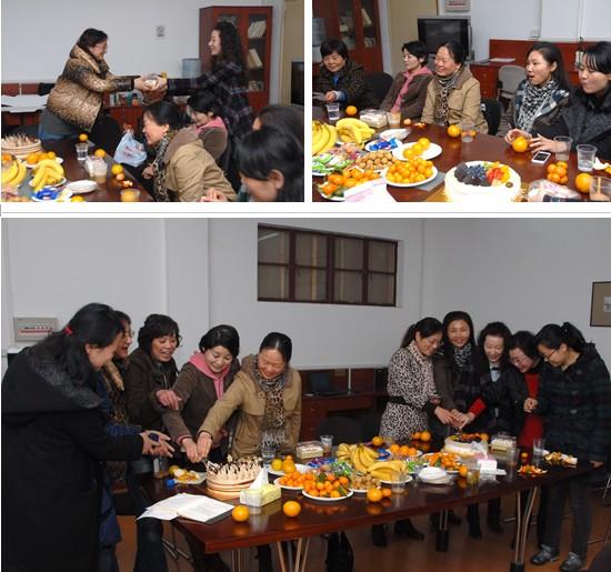 生日庆祝活动的内容丰富精彩,妇委会不仅准备了美味的蛋糕、水果、小吃,还精心设计了几组互动游戏:大家来填字、猜歇后语、方言朗诵诗歌。每位成功过关的老师都有小礼品作为奖励。大家争相回答问题,往往一个题目刚在屏幕上显示出来,好几位老师抢着回答,现场气氛十分活跃。参加活动的几位党政工青领导在游戏环节角色转换,甘当绿叶,代表男同胞表演节目,刘老师沪语朗诵徐志摩的小诗,陶老师传授浙江海宁皮革城砍价秘笈,方老师深情演唱《花儿为什么这样红》,三位男同胞的精彩节目赢得满场的笑声和掌声。新闻系的薛中军教授主动请缨,用东北方言说了一段风趣的顺口溜,逗得大家直乐,纷纷学着她说。最后,全场一起合唱生日快乐歌,持续近两个小时的庆祝活动在欢乐的歌声里结束。