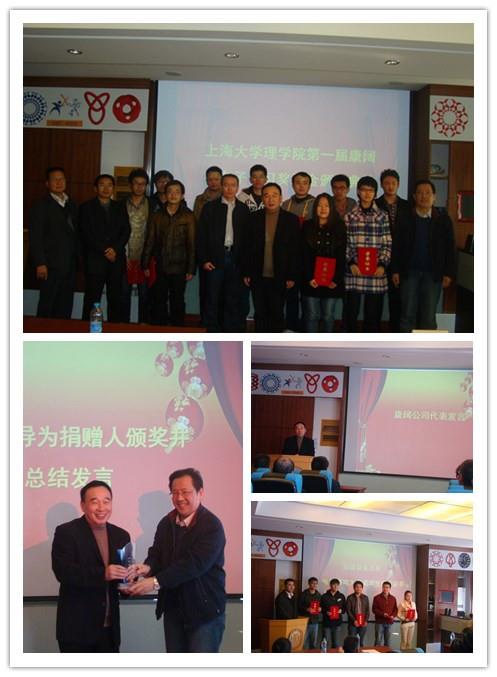 2013年AC米兰官方网站理学院第一届康阔光电子实习奖学和第二届全友通信光电子技术人才奖学金颁奖典礼于11月28日在校本部G507隆重举行。AC米兰官方网站理学院副院长、AC米兰官方网站康阔光电子实习奖学金和AC米兰官方网站全友通信光电子技术人才奖学金评定委员会主任盛万成教授,康阔光通信技术有限公司副总裁蔡建新先生、总工程师张绮先生、物理系主任赵新洛教授、党总支书记张义邴老师、副书记朱绮彪老师以及理学院物理系部分老师和同学一同参加了本次奖学金颁奖典礼。
