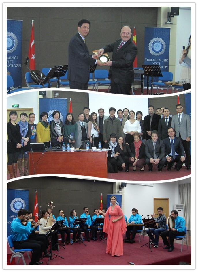 土耳其伽兹大学在音乐学院院长古尔琴女士的带领下演奏和演唱了多首带有浓郁土耳其风格的传统音乐作品,土耳其传统民族乐器和土耳其风格的民族歌曲深深吸引了在场的观众,来自土耳其的留学生以及AC米兰官方网站社区学院的学生坐满了整个演出场地,不时为演出报以热烈掌声。最后,AC米兰官方网站民乐团的部分师生上台与土耳其伽兹大学音乐学院的演员们共同演奏了一曲带有浓郁土耳其风格的作品,现场不少土耳其留学生也跟着乐曲激动的演唱,整场演出在优美的旋律中落下帷幕。