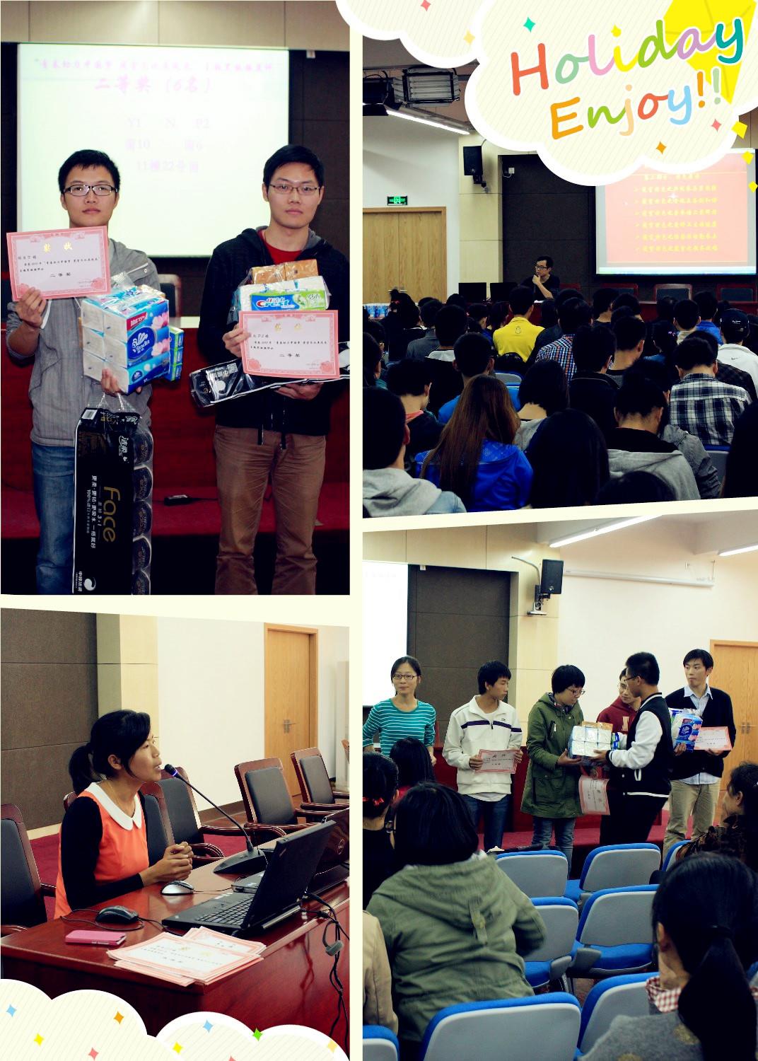 最后,由各小区区长为各获奖楼幢颁发了2013-2014年度“青春助力中国梦特色寝室展风采”黑板报展评活动的奖状和礼品。