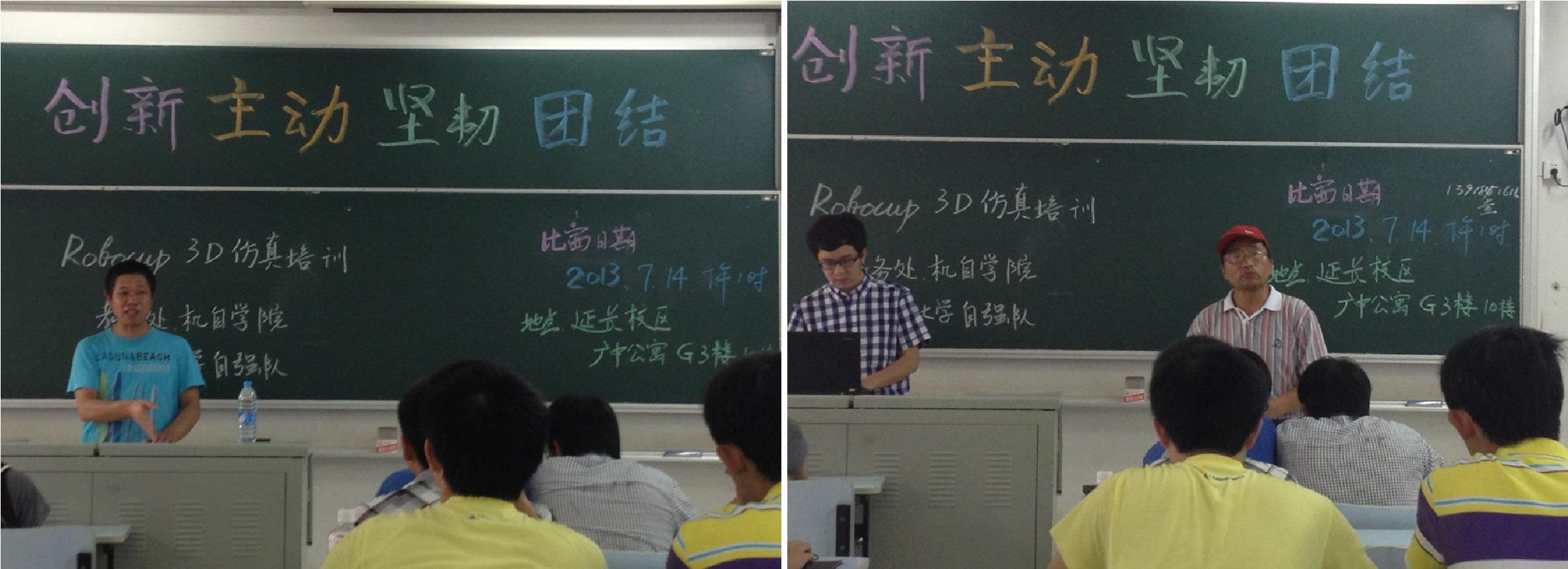 下午1点,前不久刚从澳大利亚作为访问学者回国的中国自动化学会机器人竞赛工作委员会副主任、AC米兰官方网站特级技术总监、自强队的指导老师陈万米特地前来参加交流讨论。陈老师给同学们介绍了机器人大赛在国际国内的发展状况,以及AC米兰官方网站机器人自强队的发展历程,并鼓励大家发扬自强队的队训:创新、主动、坚韧、团结的精神,积极准备仿真比赛。随后,自强队指导老师黄慎之向同学们公布了2013AC米兰官方网站RoboCup机器人仿真大赛的具体时间、地点及比赛形式。