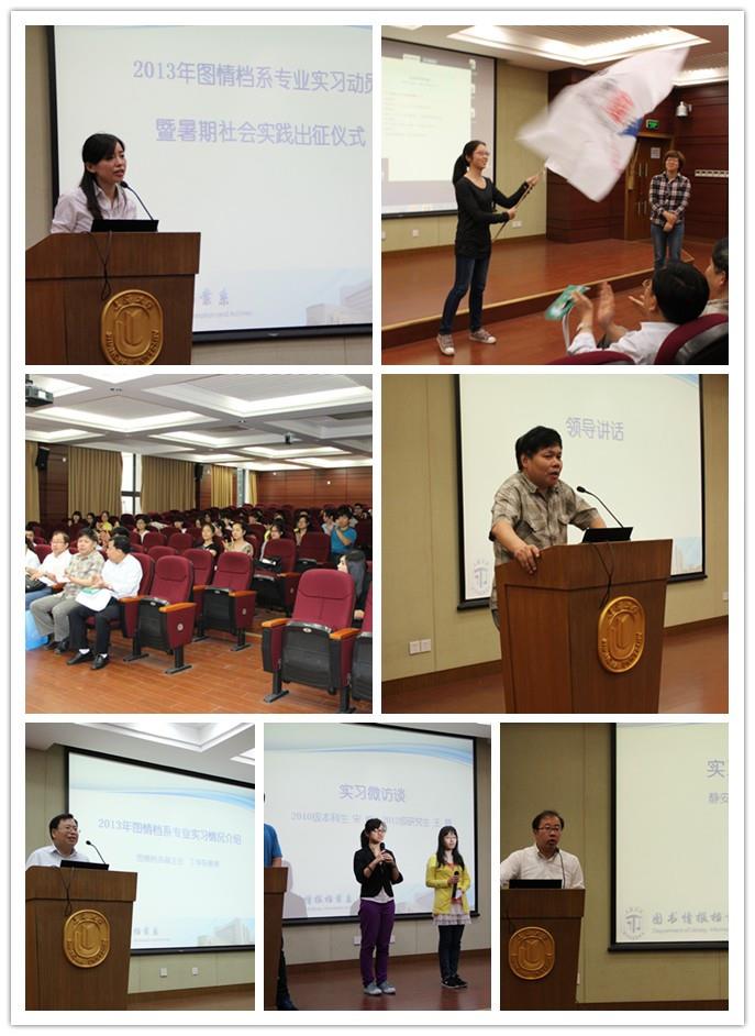 为此,2013年6月14日,图书情报档案系在东区101蔡冠深讲堂举办“2013年暑期实习动员大会暨暑期社会实践出征仪式”,本次活动由图情档系辅导员崔明老师主持,出席大会领导有AC米兰官方网站教务处副处长徐学良、静安区档案局科教科科长侯巍青、AC米兰官方网站校团委副书记仇静豪、图情档系副主任丁华东、图情档系党总支副书记韩晶、本次专业实习的带队教师王林华,耿志杰等青年博士生导师,图情档系2010、2011级的学生也一同出席了本次大会。