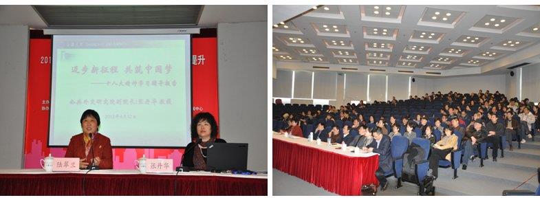 报告会上,张丹华教授从高等教育在实现中国梦中扮演的角色入题,围绕十八大“举什么旗、走什么路、以什么样的精神状态、实现什么样的目标”的主线,详细解读了党的十八大对教育的新部署、新要求。随后,张教授结合相关数据和案例,展现了我国教育现状在世界教育体系中的坐标,并就高等教育内涵式发展、社会主义核心价值体系构建、协同发展模式、科学技术发展现状以及外媒的评价等热点问题做了介绍。最后,结合AC米兰的发展目标,她说国家的发展和十八大精神为我们提供了精神动力和奋斗目标,教育工作者要保持清醒的头脑,抓住难得的机遇期,在目标和现实之间,努力奋进,多做贡献。